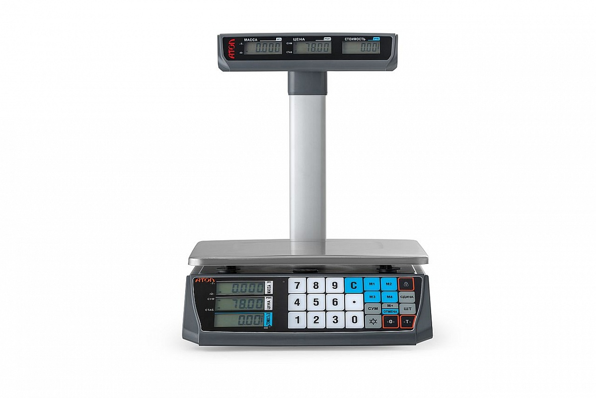 Весы АТОЛ MARTA - электронные весы для взвешивания товаров в гипермаркетах, магазинах и на рынках, а также на предприятиях общественного питания, имеют все необходимые режимы и функции: взвешивание, расчет стоимости и сдачи, 4 клавиши быстрого вызова цены.